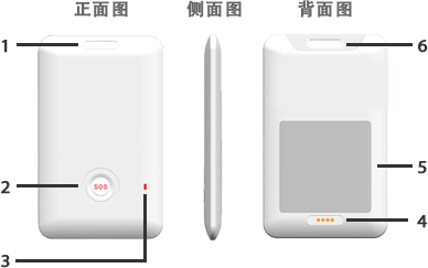1. 掛孔 2.報警按鍵 3.指示燈 4.磁吸充電口 5.銘牌 6.掛孔