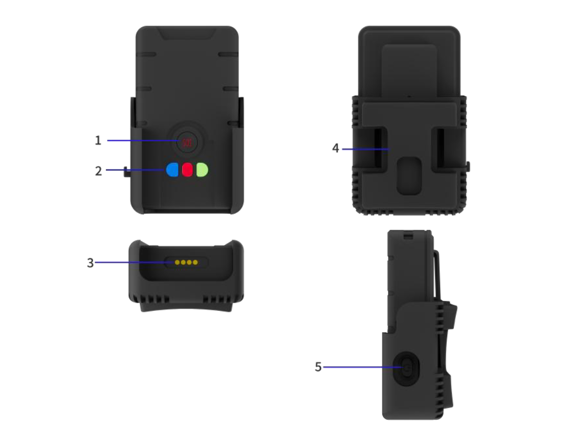 1、SOS按鍵 2、爆閃燈/指示燈 3、磁吸充電口 4、固定底座 5、電源開關
