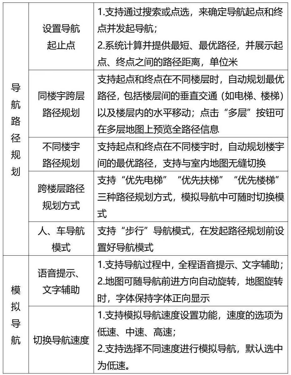 該系統(tǒng)以室內(nèi)外一體化導(dǎo)航能力為核心,構(gòu)建了覆蓋多場景的功能體系:在地圖展示層面,支持室內(nèi)外地圖一體化加載、手繪地圖及三維模型可視化呈現(xiàn),搭配大小、視角、樓層的靈活調(diào)整功能,實(shí)現(xiàn)空間信息的精準(zhǔn)還原;POI位置點(diǎn)詳情查詢、收藏分享機(jī)制,結(jié)合POI列表搜索、模糊搜索、公共設(shè)施及分類搜索等多元檢索方式,確保目標(biāo)地點(diǎn)快速定位;多場景路徑規(guī)劃算法與實(shí)時導(dǎo)航功能,輔以樓層導(dǎo)視與智能尋車模塊,從醫(yī)院科室導(dǎo)航到商場店鋪查找、停車場車輛定位,全面解決復(fù)雜環(huán)境下的路徑指引需求。其他系統(tǒng)功能持續(xù)完善優(yōu)化,同時支持客戶定制化開發(fā),以更貼合行業(yè)特性的導(dǎo)航解決方案,開啟智慧空間服務(wù)新范式。