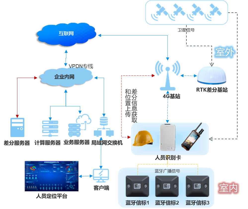 新銳科創RTK+藍牙融合定位系統由多個關鍵部分協同組成,包括RTK基準站、藍牙信標、定位終端以及定位管理平臺,各部分相互配合,構建起一個完整、高效的人員定位管理體系。
