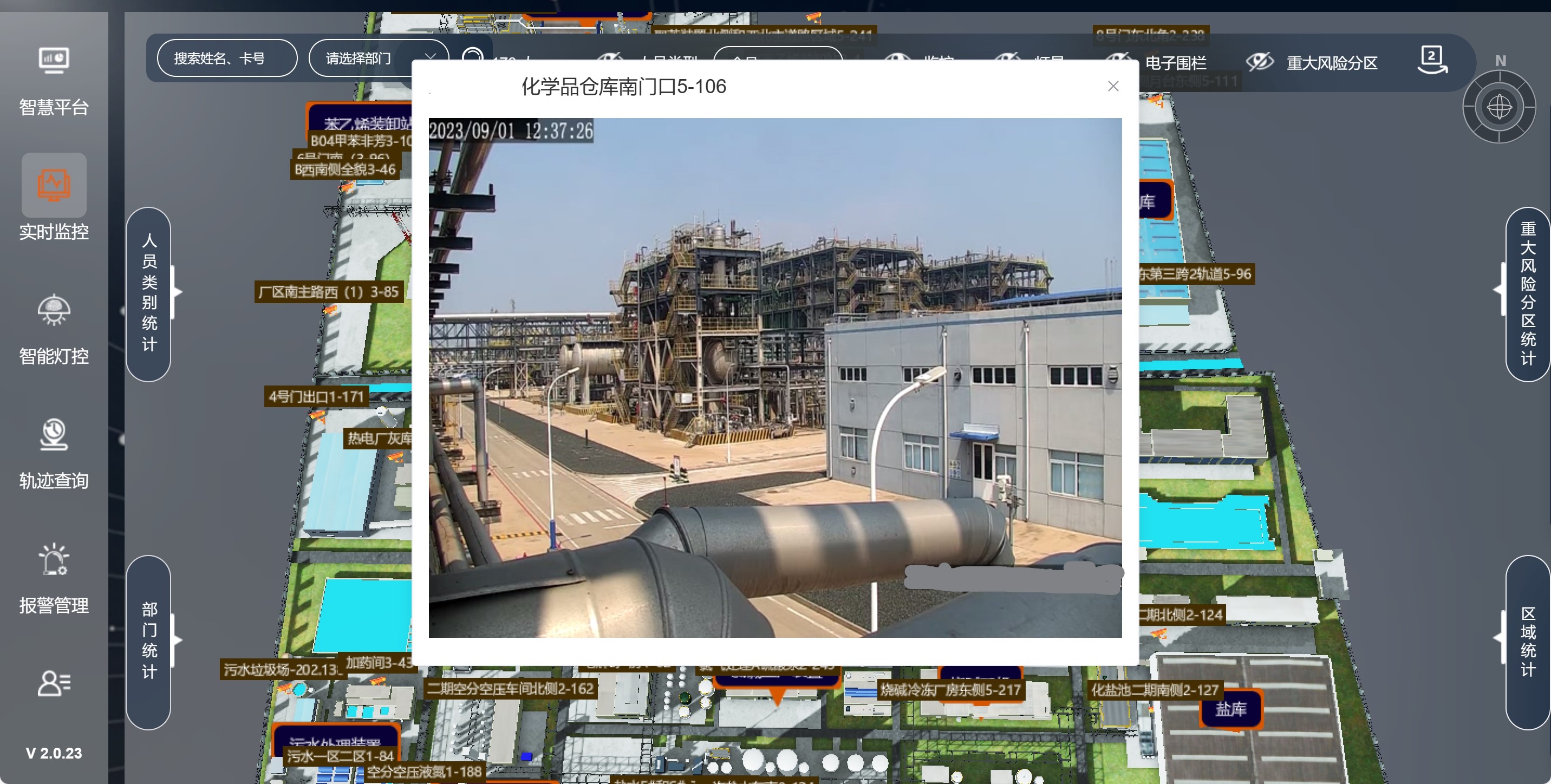 通過3D電子地圖動態展示人員分布,對高危區域、關鍵設備區設置電子圍欄,實現進入權限、停留時長的精細化管理,超員、缺員等情況自動統計告警;