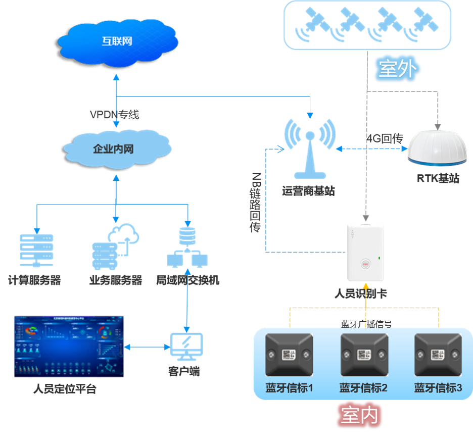 4G+藍牙+RTK人員定位系統方案拓撲圖